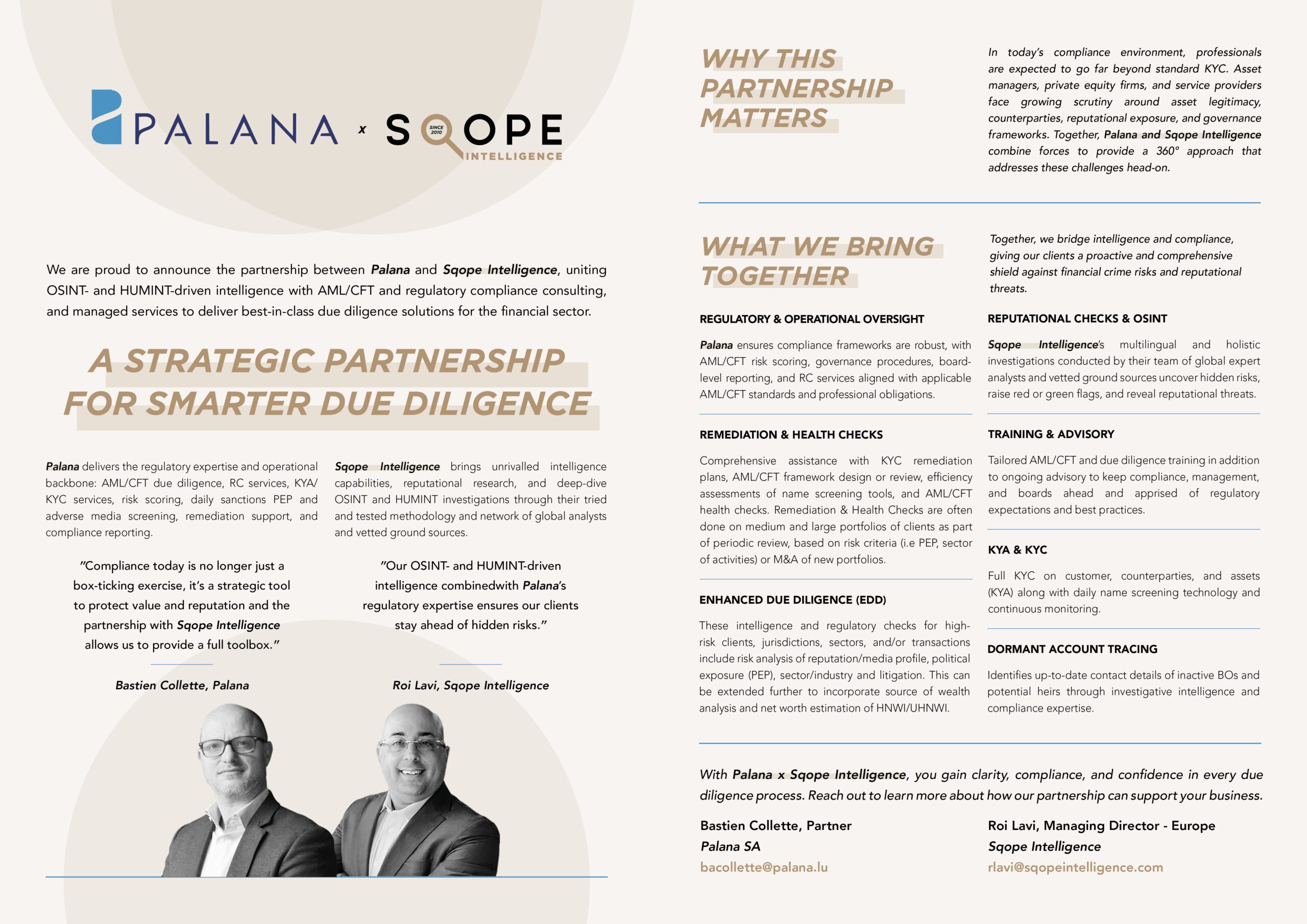 By combining Sqope Intelligence’s OSINT- and HUMINT-driven investigative capabilities with Palana’s AML/CFT and regulatory compliance expertise, we offer a comprehensive, 360° approach to due diligence, reputational risk assessment, and regulatory oversight.